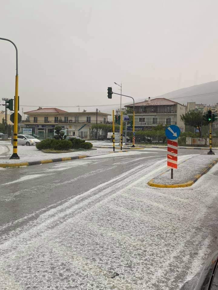 Μάλιστα, σημειώθηκε και ιδιαίτερα έντονη χαλαζόπτωση ακόμη και μέσα στην πόλη, με το χαλάζι να σκεπάζει δρόμους και αυλές σπιτιών.