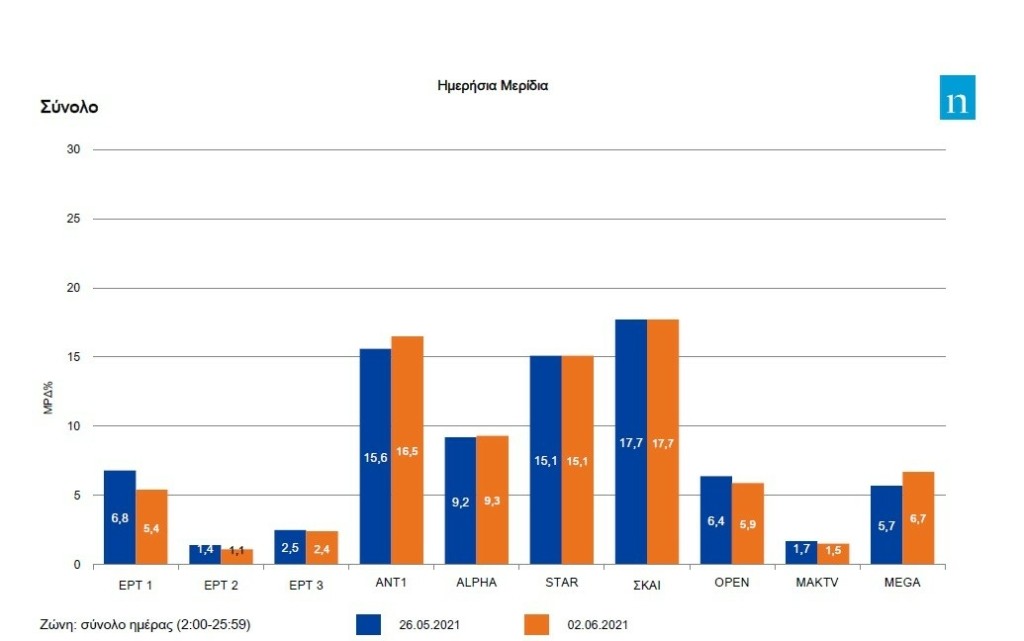 Σύμφωνα με τις μετρήσεις της Nielsen για την Τετάρτη 2 Ιουνίου, πρώτος στον πίνακα της τηλεθέασης είναι ο ΣΚΑΪ με 17,7%, δεύτερος είναι ο ΑΝΤ1 με 16,5%, τρίτο είναι το Star με 15,1% και τέταρτος ο Alpha με 9,3%.