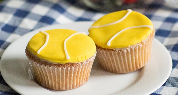 Προθερμάνετε το φούρνο στους 160ο C και καλύψτε με χάρτινες θήκες μια φόρμα για μάφιν 12 θέσεων. Σε ένα μπολ, χτυπήστε με το μίξερ το βούτυρο με τη ζάχαρη μέχρι να αφρατέψουν και να κρεμώσουν. Ρίξτε τα αυγά ένα -ένα χτυπώντας τα και περιμένετε μέχρι να ενσωματωθεί καλά το καθένα στο μίγμα, μέχρι να ρίξετε το επόμενο. Κοσκινίστε το αλεύρι και ανακατέψτε απαλά μέχρι να ενσωματωθεί κι αυτό πλήρως. Τέλος προσθέστε το εκχύλισμα λεμονιού και το γάλα, ρίχνοντας ένα τελευταίο ανακάτεμα, πριν προσθέσετε το μίγμα στις θήκες. Γεμίστε μόνο τα 2/3 από τις θήκες για να έχετε πιο ομοιόμορφα καπκεικς . Ψήστε για 15 – 20 λεπτά μέχρι να ροδίσουν και να ψηθούν στο κέντρο τους. Αφαιρέστε τα από το φούρνο και αφήστε τα να κρυώσουν εντελώς. Με ένα μυτερό μαχαίρι χαράξτε τα στο κέντρο τους και αφαιρέστε ένα μικρό κύλινδρο ζύμης. Γεμίστε τη λακουβίτσα που έχει δημιουργηθεί με ένα κουταλάκι του γλυκού λεμονόκρεμας και σφραγίστε τοποθετώντας ξανά από πάνω τον κύλινδρο ζύμης. Καλύψτε την επιφάνεια του κέικ με λίγη μαρμελάδα για να κολλήσει καλύτερα η ζαχαρόπαστα. Ανοίξτε με τη βοήθεια του πλάστη ένα κομμάτι ζαχαρόπαστας και χρησιμοποιώντας ένα κουπ πατ κόψτε κύκλους στο ίδιο μέγεθος με την επιφάνεια του καπκέικ. Κολλήστε τους πάνω από τη μαρμελάδα για να ασφαλίσουν καλά. Με το νερόγλασο (ζάχαρη άχνη με λίγες σταγόνες νερό τόσο ώστε να επιτύχετε μια παχιά σύσταση) και ένα κορνέ τραβήξτε γραμμές για να σχηματίσετε τις ρίγες στις μπάλες του τένις. Αφήστε να στεγνώσει και στη συνέχεια απολαύστε!