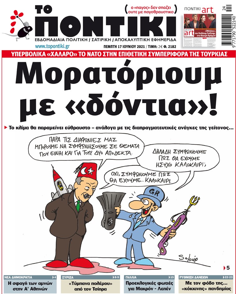 Με πρωτοσέλιδο τίτλο «Μορατόριουμ με “δόντια”!» και αναλυτικό – αποκαλυπτικό ρεπορτάζ για τη στάση του ΝΑΤΟ στην επιθετική συμπεριφορά της Τουρκίας κυκλοφορεί το «ΠΟΝΤΙΚΙ» το πρωί της Πέμπτης.