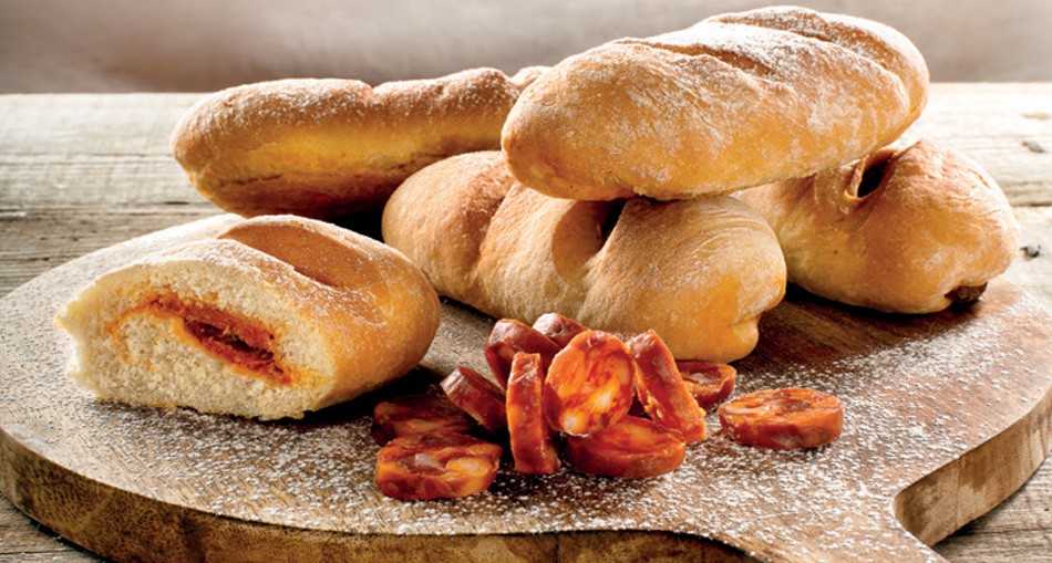 Προθερμάνετε το φούρνο στους 200ο C και σε ελαφρά αλευρωμένη επιφάνεια, ανοίξτε τη ζύμη με τη βοήθεια του πλάστη σε μεγάλο ορθογώνιο σχήμα. Απλώστε τις φέτες λουκάνικου, έτσι ώστε να καλύψετε όλη την επιφάνεια της ζύμης και τυλίξτε τη ζύμη σε μακρύ ρολό. Κόψτε σε ρολάκια – ψωμάκια (περίπου 10) και τοποθετήστε τα σε ταψί υπενδεδυμένο με αντικολλητικό χαρτί.