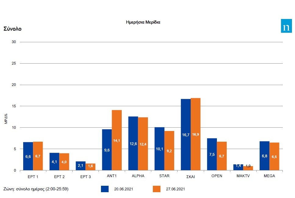 Σύμφωνα με τις μετρήσεις της Nielsen για την Κυριακή 27 Ιουνίου, πρώτος στον πίνακα της τηλεθέασς ήταν ο ΣΚΑΪ με 16,9%, δεύτερος ήταν ο ΑΝΤ1 με 14,1%, τρίτος ο Alpha με 12,4% και τέταρτο το Star με 9,2%.