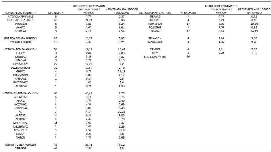 325 κρούσματα εντοπίστηκαν στην Αττική εκ των οποίων τα 95 στην Αθήνα, ενώ στη Θεσσαλονίκη καταγράφηκαν 31 νέες μολύνσεις. Αναλυτικά: