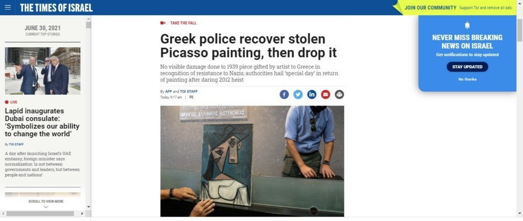 Το viral video με την πτώση έγινε θέμα και στο ισραηλινό σάιτ Times of Israel που εξιστορεί το κωμικοτραγικό περιστατικό με τον γλαφυρό τίτλο: «Η Ελληνική Αστυνομία ανακτά κλεμμένο πίνακα του Πικάσο, μετά τον ρίχνει κάτω…»