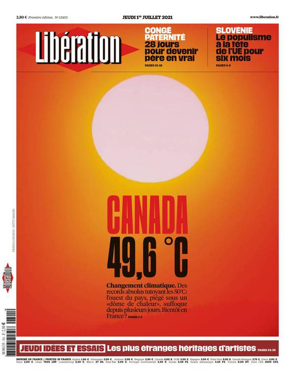 «Καναδάς 49,6 βαθμοί Κελσίου. Απόλυτα ρεκόρ θερμοκρασίας που πλησιάζουν τους 50 βαθμούς Κελσίου. Τα δυτικά της χώρας, παγιδευμένα σε έναν «θόλο ζέστης», ασφυκτιούν εδώ και αρκετές ημέρες. Έρχεται και η σειρά της Γαλλίας;», αναρωτιέται η Libearation στο συγκλονιστικό της πρωτοσέλιδο.