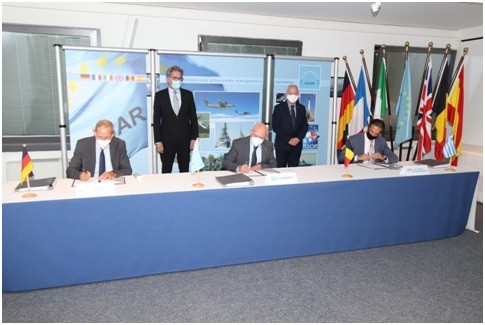 Στιγμιότυπο από την τελετή υπογραφής του συμβολαίου στην έδρα του OCCAR στη Bόννη – από αριστερά: Andreas Hülle, Διευ/νων Σύμβουλος της Hensoldt Optronics, Joachim Sucker, γερμανικό μέλος του Εποπτικού Συμβουλίου, Matteo Bisceglia, Διευθυντής OCCAR-EA, Rudy Debaene, βελγικό μέλος του Εποπτικού Συμβουλίου, και Κρίστιαν Χατζημηνάς, CEO Theon Sensors