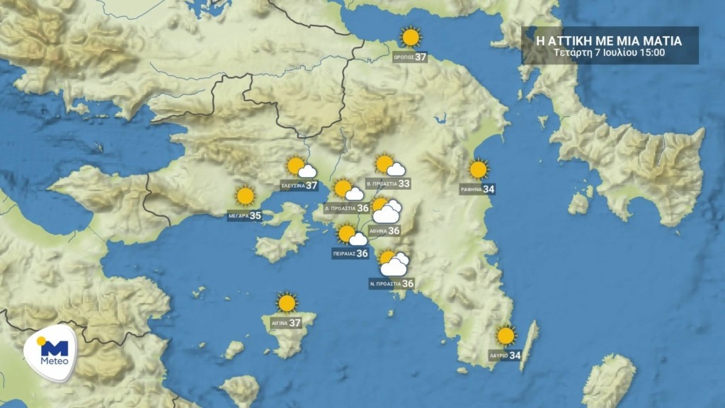 Στην Αττική αναμένεται ηλιοφάνεια. Οι άνεμοι θα πνέουν από βόρειες διευθύνσεις έως 3 μποφόρ. Η θερμοκρασία στο κέντρο των Αθηνών θα κυμανθεί από 27 έως 36 βαθμούς Κελσίου.