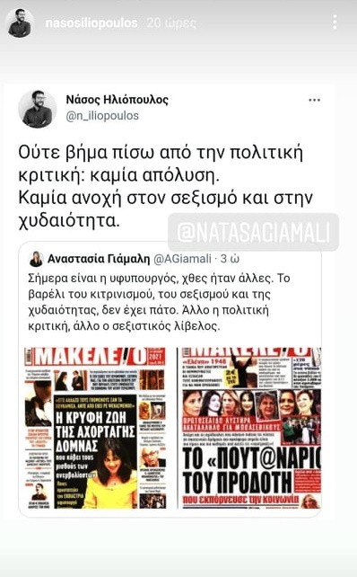 «Σήμερα είναι η υφυπουργός, χθες ήταν άλλες. Το βαρέλι του κιτρινισμού, του σεξισμού και της χυδαιότητας, δεν έχει πάτο. Άλλο η πολιτική κριτική, άλλο ο σεξιστικός λίβελος» έγραψε η δημοσιογράφος στους προσωπικούς της λογαριασμούς στα social media.