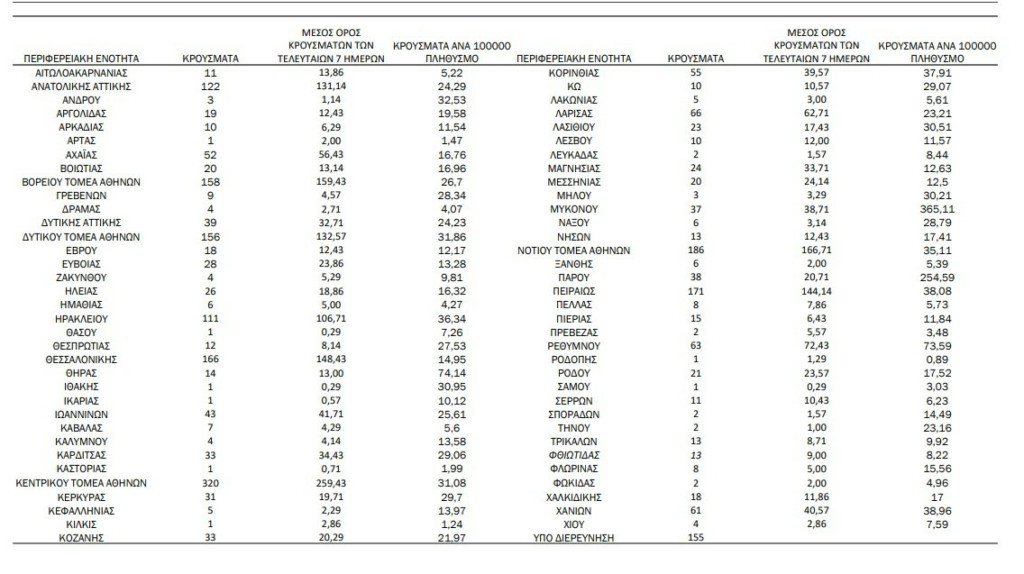 Σύμφωνα με τη γεωγραφική κατανομή τα 1.165 κρούσματα εντοπίζονται στην Αττική, 166 στη Θεσσαλονίκη, 66 στη Λάρισα και 37 στη Μύκονο που από το απόγευμα βρίσκεται σε νέο lockdown.