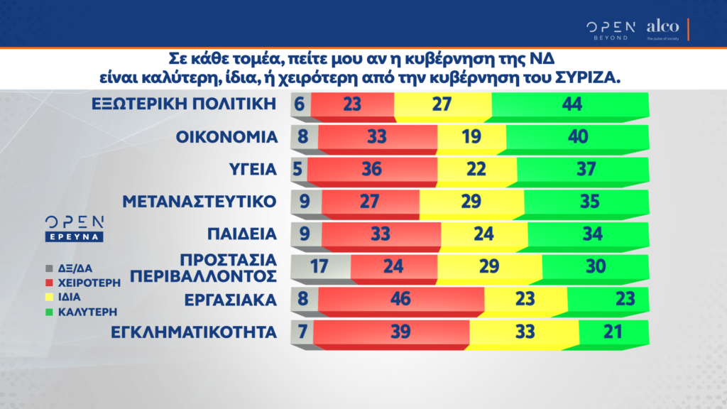 «Αγκάθια» για την κυβέρνηση αποτελούν τα εργασιακά και η εγκληματικότητα, όπως προκύπτει από τη νέα δημοσκόπηση της Alco. Συγκεκριμένα, η δημοσκόπηση έδειξε ότι η κυβέρνηση της ΝΔ είναι χειρότερη από την κυβέρνηση του ΣΥΡΙΖΑ στη διαχείριση αυτών των ζητημάτων. Συγκεκριμένα, στα Εργασιακά, το 46% πιστεύει ότι η κυβέρνηση της ΝΔ είναι χειρότερη έναντι του 23% που πιστεύει το αντίθετο, ενώ στην Εγκληματικότητα, το 39% έναντι του 21%.