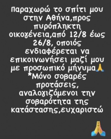 «Παραχωρώ το σπίτι μου στην Αθήνα, προς πυρόπληκτη οικογένεια, από 12/8 εώς 26/8. Όποιος ενδιαφέρεται, να επικοινωνήσει μαζί μου με προσωπικό μήνυμα. Μόνο σοβαρές προτάσεις, αναλογιζόμενοι την σοβαρότητα της κατάστασης. Ευχαριστώ».