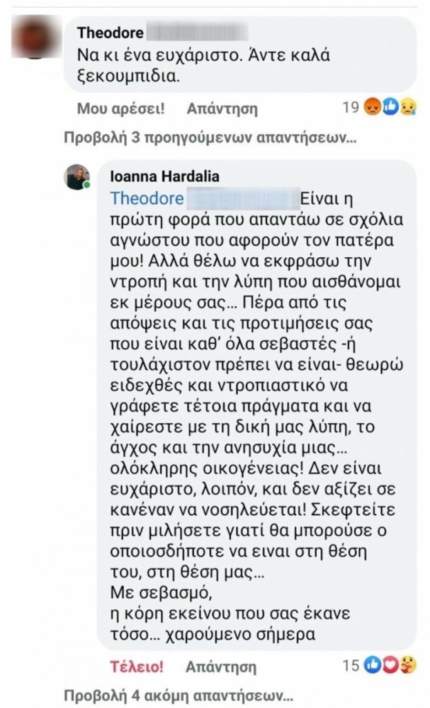 Συγκεκριμένα, η Ιωάννα Χαρδαλιά απάντησε σε σχολιαστή: «Είναι η πρώτη φορά που απαντάω σε σχόλια αγνώστου που αφορούν τον πατέρα μου. Αλλά θέλω να εκφράσω την ντροπή και τη λύπη που αισθάνομαι εκ μέρους σας. Πέρα από τις απόψεις και τις προτιμήσεις σας, που είναι καθ’όλα σεβαστές, η τουλάχιστον πρέπει να είναι, θεωρώ ειδεχθές και ντροπιαστικό να γράφετε τέτοια πράγματα και να χαίρεστε με τη δική μας λύπη, το άγχος και την ανησυχία μιας ολόκληρης οικογένειας.
