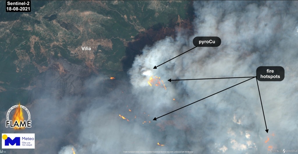 Ειδικότερα, η πυρκαγιά στα Βίλια αρχικά εξαπλώθηκε (Δευτέρα 16.08 και Τρίτη 17.08) καθοδηγούμενη από το συνοπτικό άνεμο που έπνεε στην περιοχή (wind-driven πυρκαγιά). Κατά τη διάρκεια της Τετάρτης 18 Αυγούστου 2021, η επικράτηση ασθενέστερων ανέμων και αστάθειας στην ατμόσφαιρα βοήθησε ώστε η πυρκαγιά να αναπτύξει ισχυρή επαγωγική στήλη (ισχυρά ανοδικά ρεύματα εξαιτίας της πολύ ισχυρής θέρμανσης του αέρα από την καύση της καύσιμης ύλης), οδηγώντας τελικά στην εμφάνιση πυροσωρείτη.