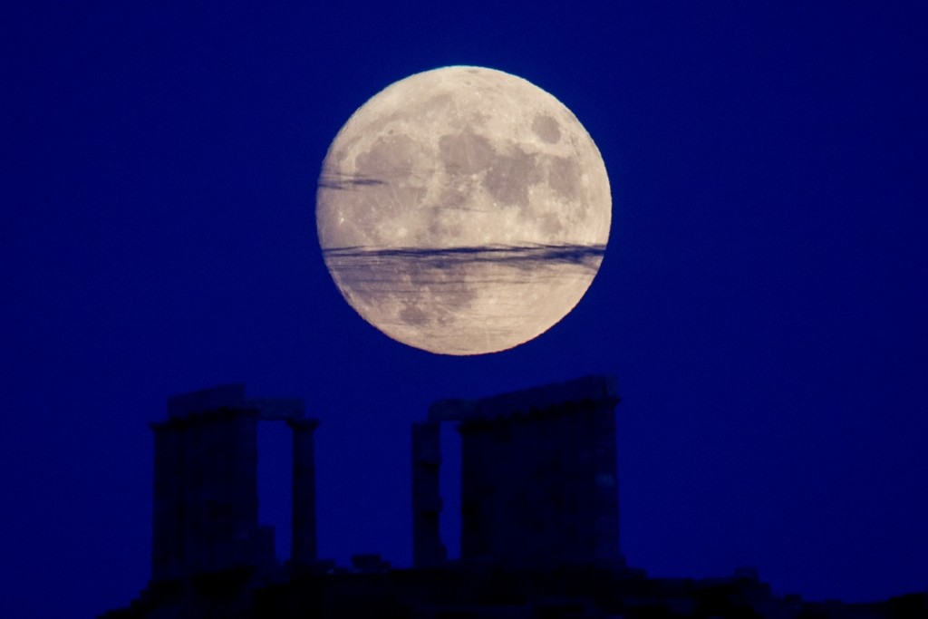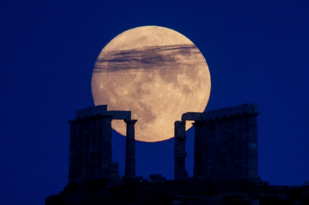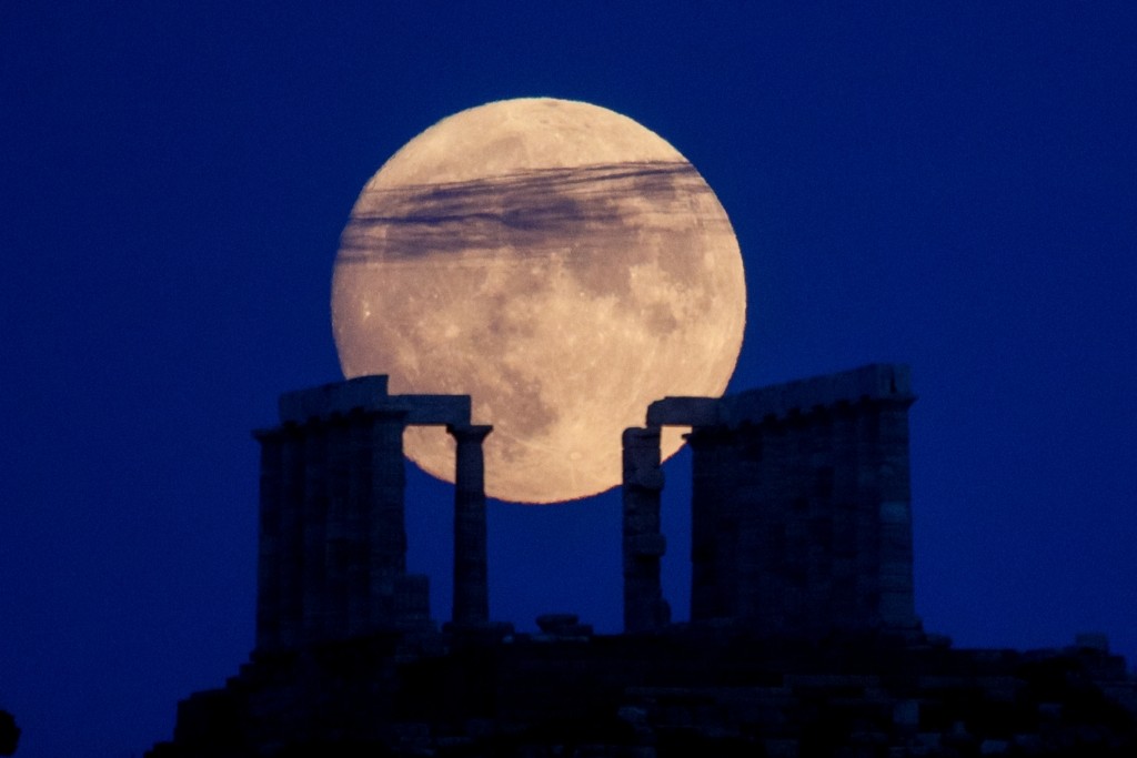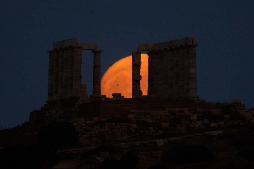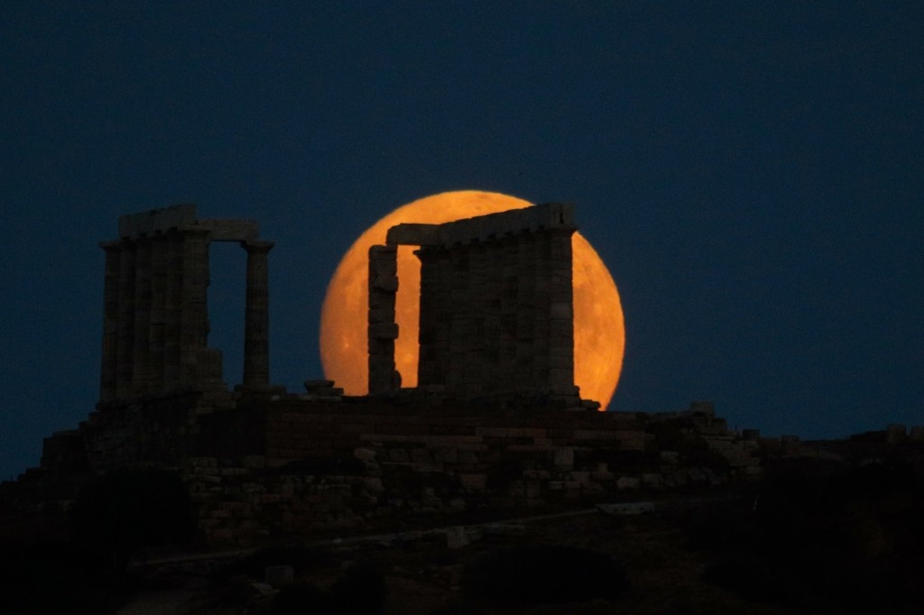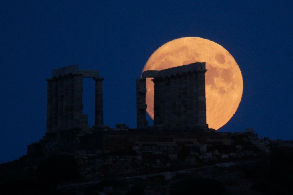 Την τελευταία βραδιά πριν την Πανσέληνο του Αυγούστου, ένα εντυπωσιακό, όμορφο φεγγάρι ξεπρόβαλε πίσω από τον ναό του Ποσειδώνα στο Σούνιο.
