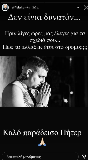 «Δεν είναι δυνατόν… Πριν λίγες ώρες μας έλεγες για τα σχέδιά σου… Πώς τα άλλαξες έτσι στο δρόμο;;;; Καλό παράδεισο Πήτερ», είχε γράψει λίγο νωρίτερα η Τάμτα στο Instagram.