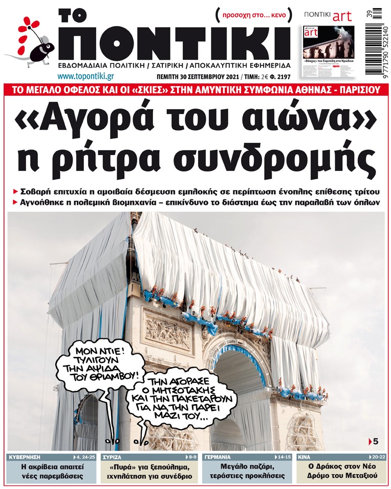 Με πρωτοσέλιδο τίτλο «”Αγορά του αιώνα” η ρήτρα συνδρομής» και αναλυτικό – αποκαλυπτικό ρεπορτάζ για το μεγάλο όφελος αλλά και τις «σκιές» της αμυντικής συμφωνίας του Παρισιού, κυκλοφορεί το «ΠΟΝΤΙΚΙ» το πρωί της Πέμπτης.