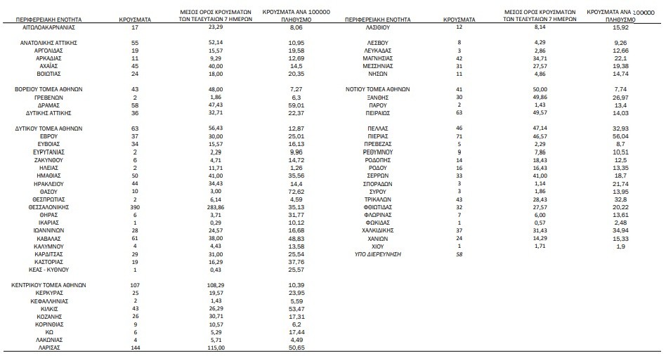 Ο συνολικός αριθμός των κρουσμάτων ανέρχεται σε 663.433 (ημερήσια μεταβολή +0.3%), εκ των οποίων 50.9% άνδρες. Με βάση τα επιβεβαιωμένα κρούσματα των τελευταίων 7 ημερών, 90 θεωρούνται σχετιζόμενα με ταξίδι από το εξωτερικό και 2.897 είναι σχετιζόμενα με ήδη γνωστό κρούσμα.