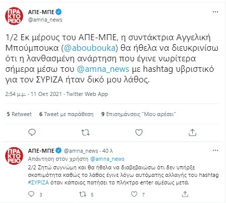 «Εκ μέρους του ΑΠΕ-ΜΠΕ η συντάκτρια Αγγελική Μπούμπουκα θα ήθελα να διευκρινίσω ότι η λανθασμένη ανάρτηση σήμερα που έγινε νωρίτερα μέσω του @amna-news με hastag υβριστικό για τον ΣΥΡΙΖΑ ήταν δικό μου λάθος».