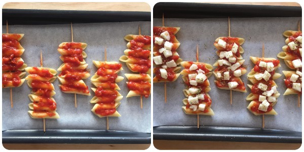 Περάστε τα βρασμένα ζυμαρικά σε ξύλινα καλαμάκια για σουβλάκια και βουρτσίστε τα με ένα πινέλο με τη σάλτσα της αρεσκείας σας και από τις δύο μεριές. Πασπαλίστε από πάνω με την τριμμένη μοτσαρέλα και διακοσμήστε με τις ελιές και τις πιπεριές ή ότι άλλο επιθυμείτε. Τοποθετήστε τα καλαμάκια μέσα σε ένα μεγάλο αντικολλητικό τηγάνι με καπάκι για λίγα λεπτά σε χαμηλή προς μέτρια φωτιά, μόνο μέχρι να λιώσει το τυρί. Σερβίρετε και απολαύστε!