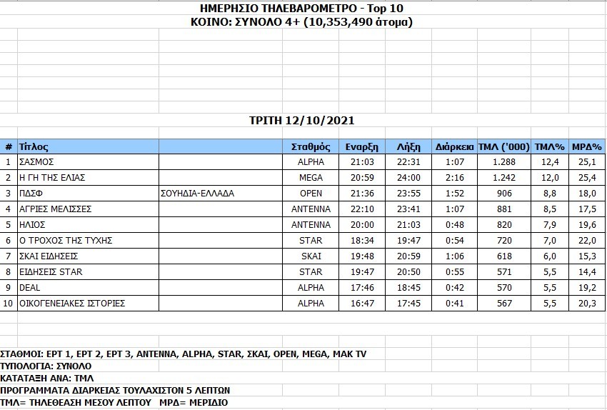 Κατά τα λοιπά ο «Σασμός» ούτε που κουνήθηκε από τη θέση του και το επεισόδιο της σειράς επέλεξαν και είδαν 1.288.000 τηλεθεατές. Τη σειρά «Η γη της ελιάς» προτίμησαν ελάχιστα λιγότεροι από εκείνους που είδαν τη σειρά του Alpha.