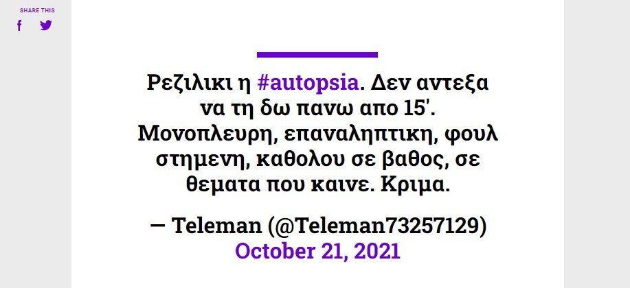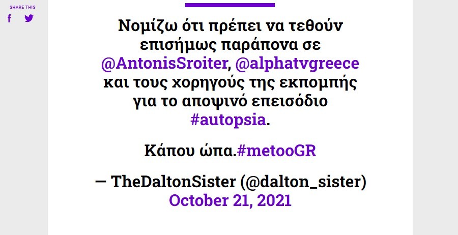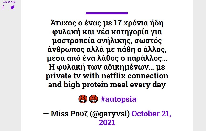 Την οργή τους στο twitter διοχέτευσαν τηλεθεατές με την προκλητική, κατά την άποψη τους, εκπομπή «Αυτοψία» την οποία ο Αντώνης Σρόιτερ επέλεξε να αφιερώσει στις φυλακές Τρίπολης όπου κρατούνται καταδικασμένοι ή υπόδικοι για σεξουαλικά εγκλήματα, ανάμεσα τους, με σοβαρές κατηγορίες, οι Δημήτρης Λιγνάδης και Πέτρος Φιλιππίδης.