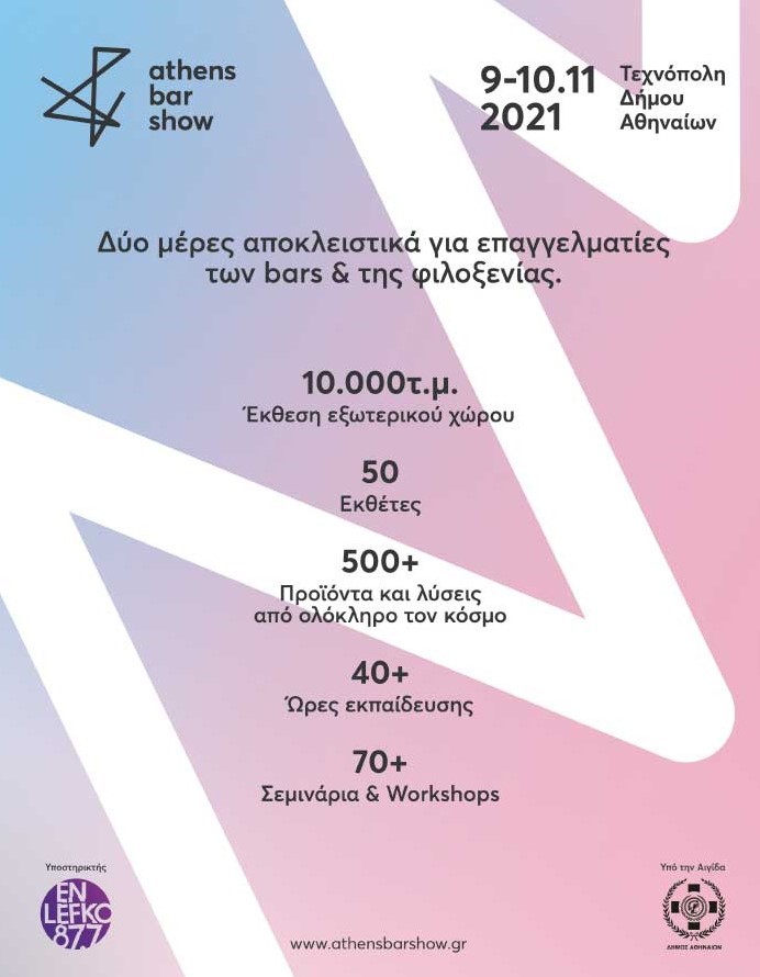 09 – 10.11 || Athens Bar Show 2021 | H καρδιά της ελληνικής bar σκηνής χτυπά στο Athens Bar Show! Δοκιμάστε περισσότερα από 1000 προϊόντα, βρείτε λύσεις για το δικό σας μπαρ, παρακολουθήστε σεμινάρια και ομιλίες από διακεκριμένους επαγγελματίες και πάρτε ιδέες για ό,τι συμβαίνει τώρα στα καλύτερα bars του κόσμου.