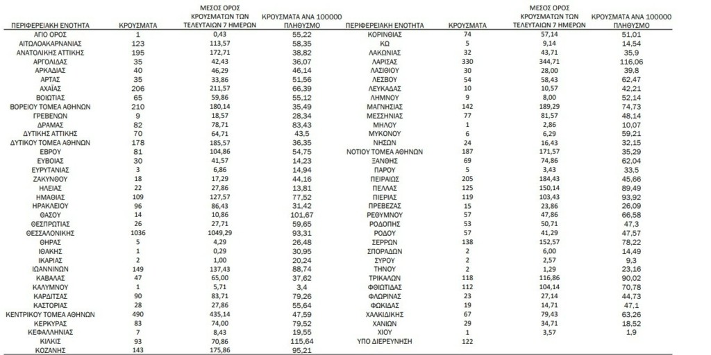 Από το σύνολο των νέων κρουσμάτων τα 1.559 εντοπίζονται στην Αττική. Ακολουθεί η Θεσσαλονίκη με 1.036, η Λάρισα με 330, η Κρήτη με 212 νέες μολύνσεις και η Αχαΐα με 206.