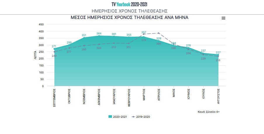 Το Δεκέμβριο 2020 πιά, ο μέσος χρόνος τηλεπαρακολούθησης έπιασε «ταβάνι» καθώς αφιερώσαμε έξι ώρες και τέσσερα λεπτά (έναντι των πέντε ωρών και τεσσάρων λεπτών το Δεκέμβριο του 2019).