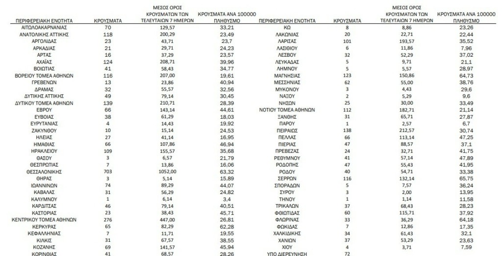 Σύμφωνα με τη γεωγραφική κατανομή, στην Αττική εντοπίστηκαν λιγότερα από 973 νέα κρούσματα και 703 στη Θεσσαλονίκη. Στην Κρήτη καταγράφηκαν 193 κρούσματα, στην Αχαΐα 124, στη Μαγνησία 123, στις Σέρρες 116 και στη Λάρισα 101.