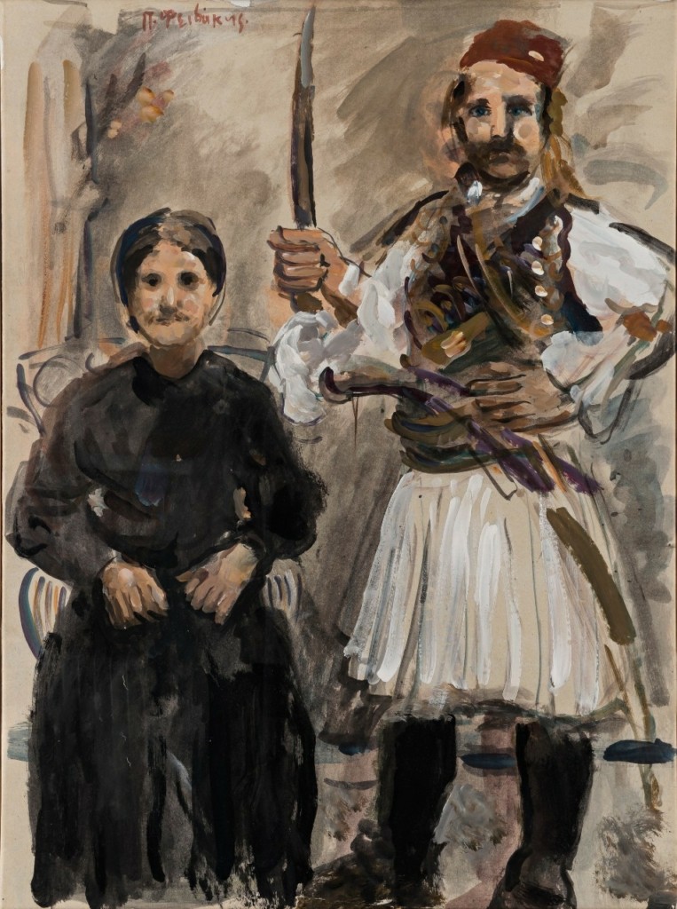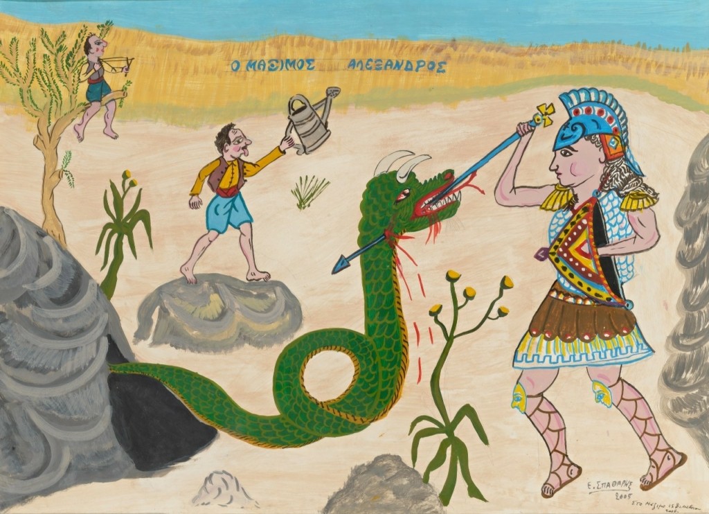 «Στα μάτια του και στα χέρια του, έκπαγλα επεισόδια μυθολογίας, ελληνικής λαϊκής παράδοσης και ηρωικής πατριωτικής ιστορίας με προεξάρχοντα τα επεισόδια από την Ελληνική Επανάσταση του 1821, μεταμορφώνονται και αποκτούν ζωή επάνω στις πιο απρόσμενες επιφάνειες: αδρά χαρτόνια και ακατέργαστα ξύλα, τσίγκοι και λιόπανα, σοβάδες καφενείων και ταπεινών σπιτιών, τρέπονται σε πεντάμορφα περιπετειώδη πεδία. Τον αναβλύζοντα κόσμο του της ελληνικής πρωτογένειας που ο ίδιος μεταφέρει μέσω αυθύπαρκτων ιδεών και ιδίων επινοήσεων, μέσω αυτής της εμμονικής εντοπιότητας που πηγάζει από την ψυχή και τα σπλάχνα της ιστορίας, μέσω του αλάνθαστου φωτεινού χρώματος και της κλασικής αυτοδίδακτης πλαστικής οντότητας, μέσω των τρυφερών καθομιλούμενων ευρημάτων και των διαχρονικών ελληνικών μύθων, οι παρόντες εικαστικοί επιχειρούν να τον προσεγγίσουν και να τον μεταλάβουν με προσήλωση και μελέτη, με απέραντη αγάπη και σεβασμό», σημειώνει στον κατάλογο η επιμελήτρια της έκθεσης.