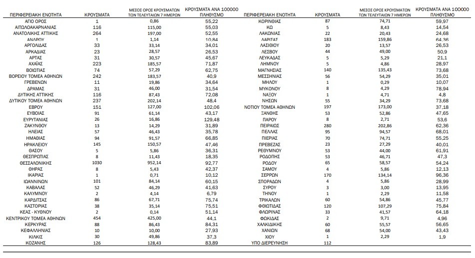 Στο «κόκκινο» παραμένει η Αττική με 1.845 νέα κρούσματα και η Θεσσαλονίκη με 1.030. Ακολουθεί η Αχαΐα με 223 νέες μολύνσεις και το Ηράκλειο Κρήτης με 145.