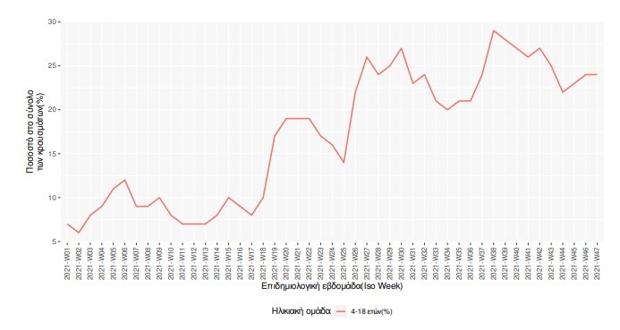 Την εβδομάδα αναφοράς, το σύνολο των ασθενών ηλικίας 4-18 ετών είναι 10.719, αποτελώντας το 24% (0% από την προηγούμενη εβδομάδα) στο σύνολο των κρουσμάτων.