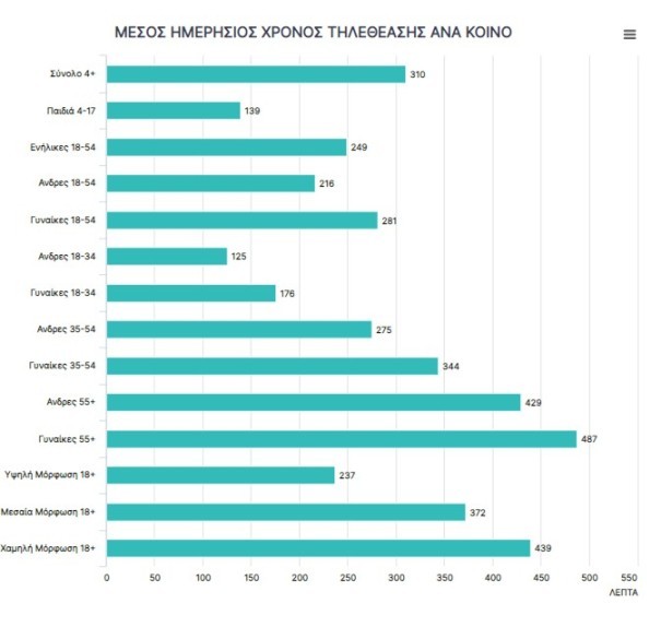 Με μέσο χρόνο παρακολούθησης πέντε ώρες και δέκα λεπτά τη σεζόν 2020-2021, οι νέοι 4-17 ετών είναι εκείνοι που αφιέρωσαν λιγότερο χρόνο μπροστά στην τηλεόραση με μόλις 139 λεπτά, ήτοι δύο ώρες και 19 λεπτά, ημερησίως.