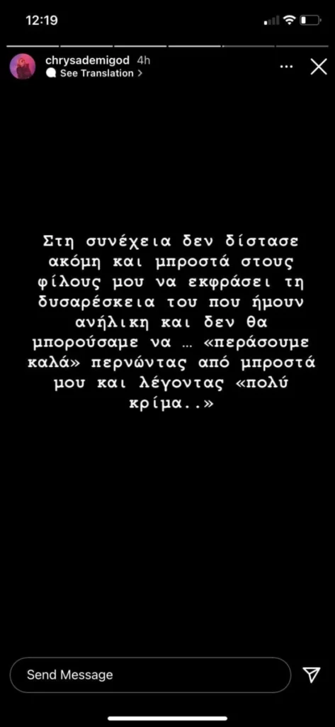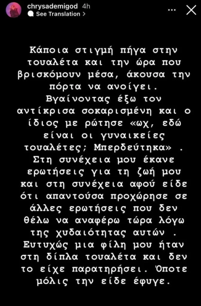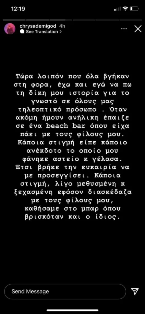 Ο λόγος για την Chrysa η οποία μέσω του λογαριασμού της στα μέσα κοινωνικής δικτύωσης περιγράφει τη δική της εμπειρία με τον παρουσιαστή, όταν τον συνάντησε τυχαία σε μπαρ, τον καιρό που η ίδια ήταν ακόμη ανήλικη.