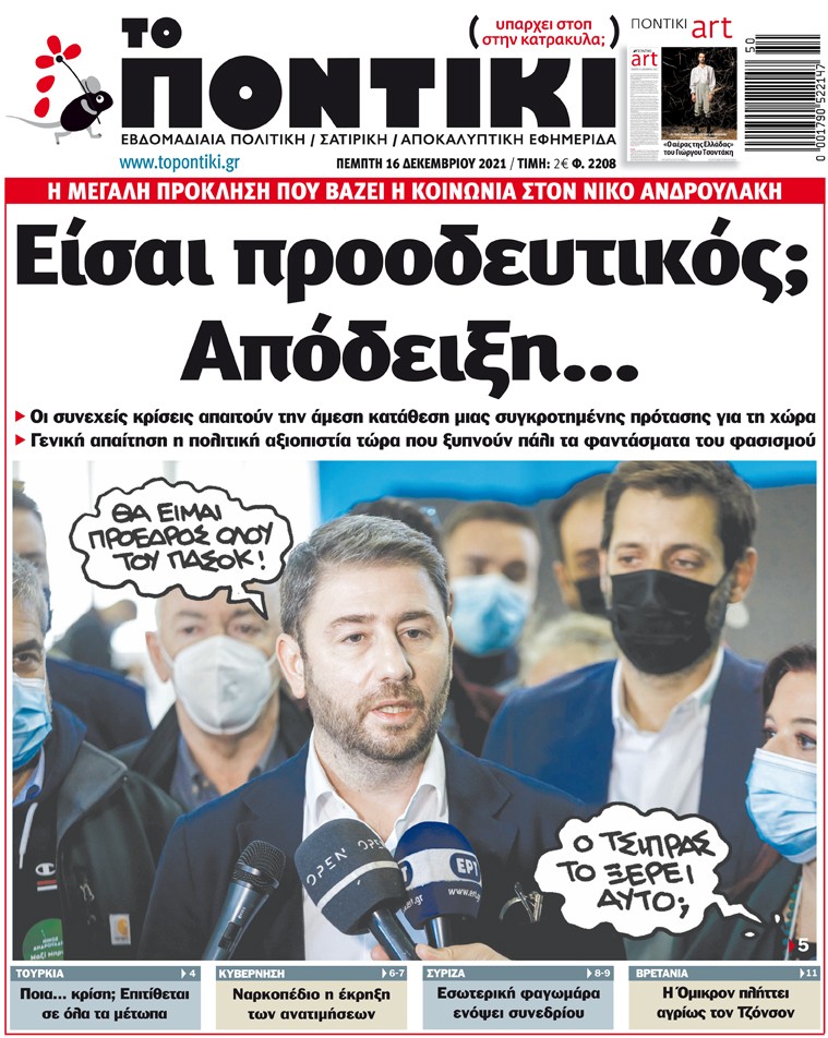 Με πρωτοσέλιδο τίτλο «Είσαι προοδευτικός; Απόδειξη…» και αναλυτικό – αποκαλυπτικό ρεπορτάζ για τη μεγάλη πρόκληση που βάζει η κοινωνία στον νέο πρόεδρο του Κινήματος Αλλαγής, κυκλοφορεί το «ΠΟΝΤΙΚΙ» το πρωί της Πέμπτης.