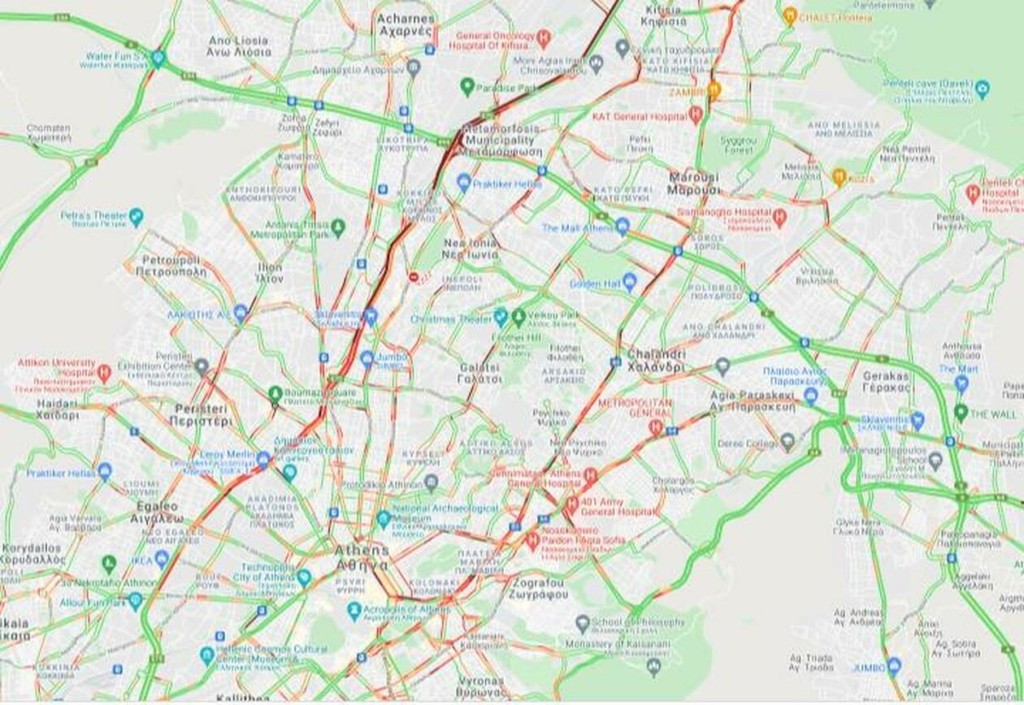 Σοβαρά προβλήματα εντοπίζονται και στην Αττική Οδό, ενώ χαμηλές ταχύτητες καταγράφονται και στα δύο ρεύματα της Κηφισίας, την Μεσογείων στο ρεύμα προς Αθήνα, την Πειραιώς, τη Χαμοστέρνας, τη Βουλιαγμένης, την Ποσειδώνος, την Αχαρνών, την Πατησίων, την λεωφόρο Αθηνών, τη Βασ. Σοφίας, τη Βασ. Κωνσταντίνου και τους δρόμους γύρω από το Σύνταγμα και το λιμάνι του Πειραιά.