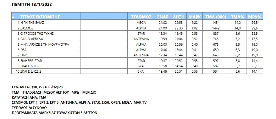 Όταν προβάλλονται οι σειρές μυθοπλασίας («Σασμός», «Η γη της ελιάς», «Άγριες μέλισσες») και τα ριάλιτι («Survivor», «MasterChef»), τα σίριαλ κινούνται μεταξύ 10% και 12,5% και τα ριάλιτι «παίζουν» από 8% έως 9,5%, το καθένα.