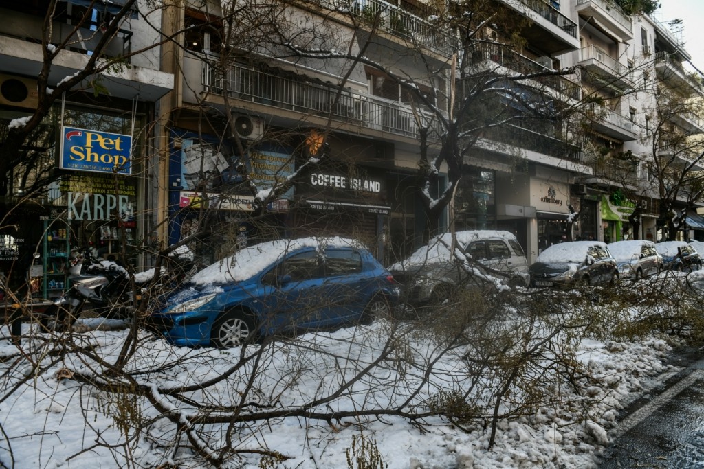 Στους Αμπελόκηπους, στην Ελληνορώσων η κατάσταση είναι ίδια ενώ σε πλατείες του Παγκρατίου έχουν πέσει πολλά δέντρα.