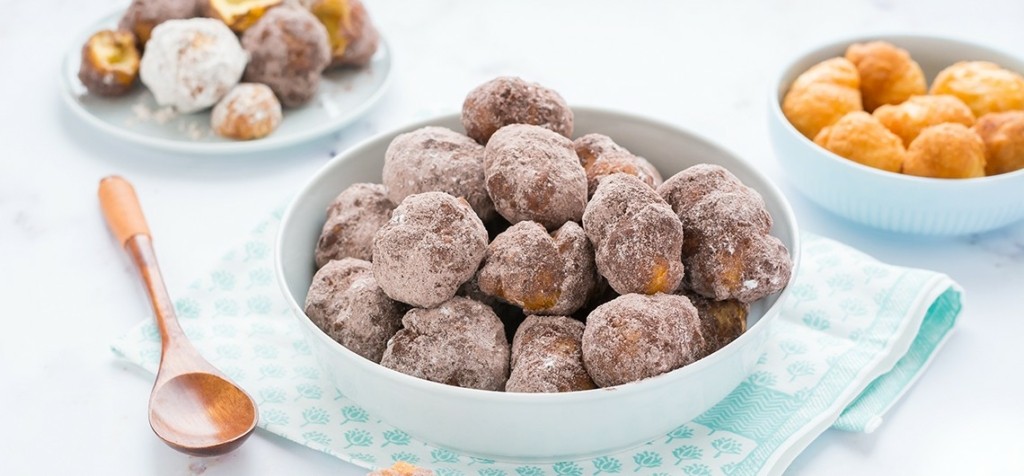 Σε μια κατσαρόλα βάλτε το γάλα, το νερό, το ρούμι (αν χρησιμοποιήσετε), το αλάτι, την κρυσταλλική ζάχαρη και το βούτυρο και αφήστε τα να βράσουν. Μόλις έρθουν σε βρασμό, ρίξτε μονομιάς το αλεύρι και με μια ξύλινη κουτάλα ανακατεύετε συνεχώς, για να ψηθεί το αλεύρι. Το μίγμα θα είναι έτοιμο μόλις σχηματιστεί μια μπάλα, η οποία θα ξεκολλάει μεν από τα τοιχώματα αλλά θα αφήνει στον πάτο της κατσαρόλας ένα λεπτό φιλμ ζύμης. Μεταφέρετε το ζυμάρι σε ένα καθαρό και κρύο μπολ και με το μίξερ χτυπήστε το για λίγα λεπτά ώστε να κρυώσει ελαφρά. Στη συνέχεια προσθέστε ένα – ένα τα αυγά, ανακατεύοντας συνεχώς και περιμένοντας να απορροφηθεί καλά το ένα πριν ρίξετε το άλλο. Η ζύμη θα πρέπει να είναι λεία και γυαλιστερή στο τέλος. Ζεστάνετε σε ένα βαθύ σκεύος το σπορέλαιο και μόλις φτάσει στη σωστή θερμοκρασία, με δυο κουταλάκια δημιουργήστε μπάλες και ρίξτε τις προσεκτικά στο καυτό λάδι. Αφήστε τα μπαλάκια ζύμης να ψηθούν σε μέτρια φωτιά για λίγα λεπτά, γυρίζοντάς τα τακτικά μέχρι να φουσκώσουν και να πάρουν ένα χρυσό καφετί χρώμα. Όταν είναι έτοιμα, στραγγίστε τα σε απορροφητικό χαρτί και στη συνέχεια ρολάρετέ τα όπως είναι ζεστά στο μίγμα του κακάο και της ζάχαρης άχνης.