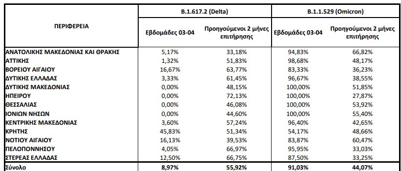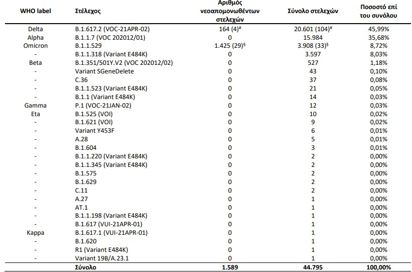 Εκ των 1.589 δειγμάτων με στελέχη ειδικού ενδιαφέροντος, τα 1.425 αφορούν στο στέλεχος Omicron και τα 164 αφορούν στο Delta. Τέσσερα (4) εκ των 164 στελεχών Delta αφορούν στο στέλεχος ΑΥ.4.2 και τα οποία εντοπίστηκαν στις Περιφερειακές Ενότητες της Ανατολικής Αττικής (1), του Βορείου Τομέα Αθηνών (1), της Λέσβου (1) και του Πειραιώς (1). Είκοσι εννέα (29) εκ των 1.425 στελεχών Omicron αφορούν στο στέλεχος ΒΑ.2, τα οποία εντοπίστηκαν σε είκοσι ένα (21) εγχώρια κρούσματα στις Περιφερειακές Ενότητες της Άρτας (1), του Βορείου Τομέα Αθηνών (1), του Δυτικού Τομέα Αθηνών (2), του Ηρακλείου (3), του Κεντρικού Τομέα Αθηνών (8), του Λασιθίου (4), της Μήλου (1) και του Νοτίου Τομέα Αθηνών (1) και σε οκτώ (8) εισαγόμενα κρούσματα.