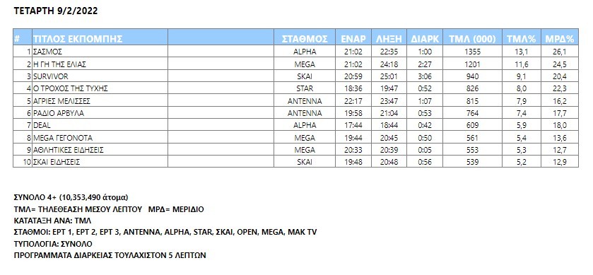 Την Τετάρτη (9/2), παραδόξως, στη δεκάδα εμφανίστηκε και το κεντρικό δελτίο του σταθμού, ψηλότερα και από το αντίστοιχο του Σκάι που συχνά πυκνά βρίσκεται στο ημερήσιο τηλεβαρόμετρο της Nielsen.