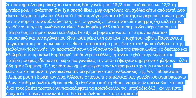 «Σε διάστημα έξι ημερών έχασα και τους δύο γονείς μου. 18 /2 τον πατέρα μου και 12/2 τη μητέρα μου. Η ανάρτηση δεν έχει σκοπό likes , μηνύματα συμπόνιας και σχόλια κάτω από αυτή. Δυο είναι οι λόγοι που γίνεται όλο αυτό. Πρώτος λόγος είναι το θέμα της ενημέρωσης των ιατρών για την πορεία των ασθενών προς τους συγγενείς, που στην περίπτωση μας όχι απλά ήταν σχεδόν ανύπαρκτη αλλά και εντελώς λανθασμένη. Δηλαδή από το σε μια-δυο μέρες παίρνει ο πατέρα σας εξιτήριο, τελικά κατέληξε. Εντάξει σέβομαι απόλυτα το ιατρονοσηλευτικό προσωπικό και τον αγώνα που δίνει κάθε μέρα στη δύσκολη εποχή του Covid. Παρακάλεσα τον γιατρό που μου ανακοίνωσε τον θάνατο του πατέρα μου, ένα καταπληκτικό άνθρωπο της Παθολογικής κλινικής, να προσπαθήσουν να λύσουν το θέμα της επικοινωνίας», ανέφερε.