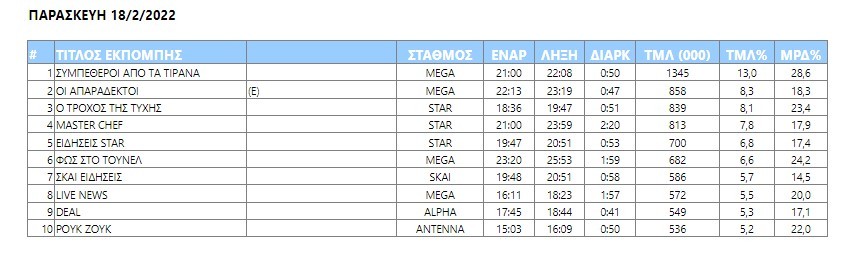 Προφανώς και η εξαιρετική γκροτέσκα κωμωδία «Συμπέθεροι απ’ τα Τίρανα» ήταν το καλύτερο από πλευρά τηλεθέασης πρόγραμμα της Παρασκευής καθώς μάζεψε στη συχνότητα του Mega 1.345.000 τηλεθεατές οι οποίοι «έστειλαν» το δείκτη τηλεθέασης ακριβώς στο 13%.