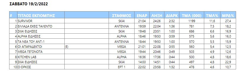 Το «Survivor» χωρίς εξάρσεις τηλεθέασης ήταν το πρόγραμμα του Σαββάτου που συγκέντρωσε τα περισσότερα βλέμματα, με δεύτερο το σόου «Ελλάδα έχεις ταλέντο» αλλά και με πέντε μονάδας διαφοράς από το ριάλιτι του Σκάι.