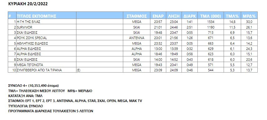 Στο τηλεβαρόμετρο της Κυριακής, σύμφωνα με τα δεδομένα της Nielsen Audience Measurement, τα μισά προγράμματα που βρέθηκαν στις διακεκριμένες θέσεις τηλεθέασης ήταν δελτία ειδήσεων, λόγω επικαιρότητας. Από αυτά, εκείνα του Σκάι και του Alpha συγκέντρωσαν τα περισσότερα βλέμματα.