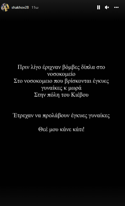 «Πριν από λίγο έριχναν βόμβες δίπλα στο νοσοκομείο. Στο νοσοκομείο που βρίσκονται έγκυες γυναίκες και μωρά. Στην πόλη του Κιέβου. Έτρεχαν να προλάβουν οι έγκυες γυναίκες. Θεέ μου κάνε κάτι!», έγραψε στο Instagram ο Ουκρανός μέσος εκφράζοντας την ξεκάθαρη αγωνία του για τη σύζυγό του.