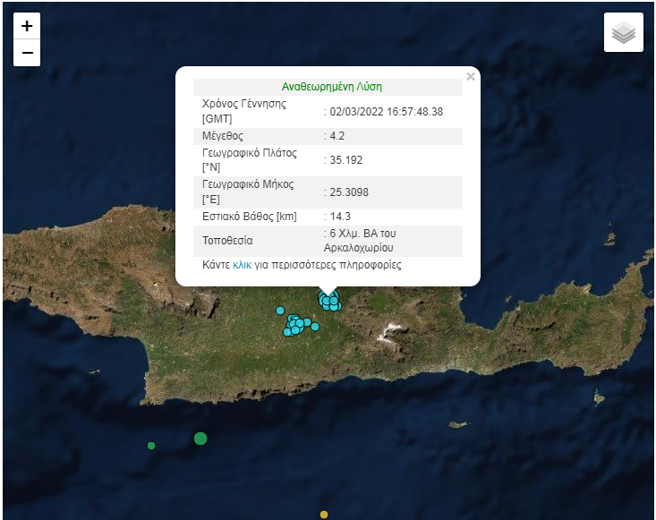 Σεισμική δόνηση μεγέθους 4,2 βαθμών της κλίμακας Ρίχτερ καταγράφηκε στις 18:57 το απόγευμα της Τετάρτης με επίκεντρο το Αρκαλοχώρι του Δήμου Πεδιάδος.