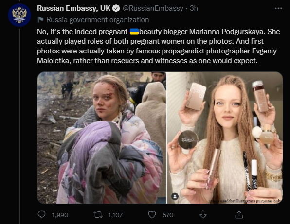 Μάλιστα, το βράδυ της Πέμπτης η ρωσική πρεσβεία στο Λονδίνο ισχυρίστηκε στους λογαριασμούς της στα social media πως οι φωτογραφίες που δείχνουν την τραυματισμένη έγκυο είναι ψεύτικες και προϊόν παραπληροφόρησης καθώς είναι μοντέλο και influencer από την Ουκρανία με το όνομα Marianna Podgurskaya.