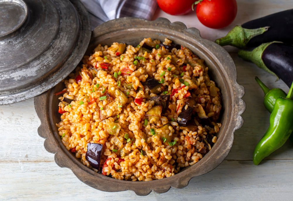 Αρχικά, προθερμάνετε το φούρνο στους 220ο C στον αέρα. Σε ένα μεγάλο μπολ βάλτε τις κομμένες μελιτζάνες με 3 κουταλιές της σούπας ελαιόλαδο, ½ κουταλάκι του γλυκού αλάτι και ανακατέψτε καλά. Απλώστε τις σε ένα ταψί που έχετε καλύψει με αντικολλητικό χαρτί και ψήστε τις στο φούρνο για 20 λεπτά περίπου ή μέχρι να μαλακώσουν και να ροδίσουν. Όταν είναι έτοιμες, βγάλτε τις και αφήστε τις στην άκρη. Εντωμεταξύ όσο ψήνονται οι μελιτζάνες, βάλτε σε μια κατσαρόλα (με καπάκι) τις άλλες 2 κουταλιές της σούπας ελαιόλαδο και ζεστάνετέ τις σε μέτρια φωτιά. Ρίξτε τα κρεμμύδια και σωτάρετέ τα για περίπου 8 λεπτά, ανακατεύοντας συνεχώς μέχρι να μαλακώσουν και να πάρουν χρώμα. Συνεχίστε με το σκόρδο για άλλα 2 λεπτά και έπειτα βάλτε τον τοματοπελτέ και τη ζάχαρη. Ανακατέψτε για 30 δευτερόλεπτα και προσθέστε τις ντομάτες, τα πιπεράκια και το νερό. Αφήστε να πάρουν μια βράση και βάλτε το πλιγούρι, τα μπαχαρικά, 1 ¼ κουταλάκι του γλυκού αλάτι και λίγο φρεσκοτριμμένο πιπέρι. Μόλις το φαγητό αρχίσει να βράζει, ρυθμίστε τη φωτιά σε πολύ χαμηλή, καπακώστε την κατσαρόλα και βράστε το για 15 λεπτά. Αποσύρετε το σκεύος από τη φωτιά, ξεκαπακώστε και αφήστε το έτσι στην άκρη για 10 λεπτά. Βάλτε τέλος τις μελιτζάνες, ανακατέψτε απαλά, πασπαλίστε με λίγο φρέσκο κόλιανδρο και νιφάδες μπούκοβο, αν επιθυμείτε, και απολαύστε!