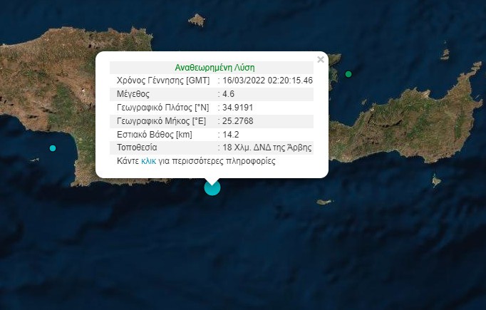 Ο σεισμός έχει επίκεντρο 17 χιλιόμετρα δυτικά – νοτιοδυτικά του παραθαλάσσιου χωριού Άρβη, στον νομό Ηρακλείου, στη νότια Κρήτη, όπως ανακοίνωσε το Γεωδυναμικό Ινστιτούτο του Εθνικού Αστεροσκοπείου Αθηνών.